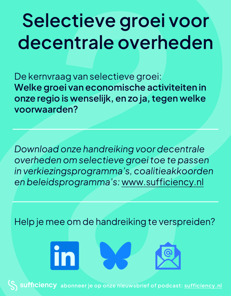 We hebben een handreiking geschreven die gemeenten en provincies concrete sturingsmechanismen en beleidsideeën biedt om selectieve groei toe te passen in verkiezingsprogramma’s, coalitieakkoorden en beleidsprogramma’s. Als je je aanmeldt voor onze nieuwsbrief, dan kun je de handreiking gratis downloaden.